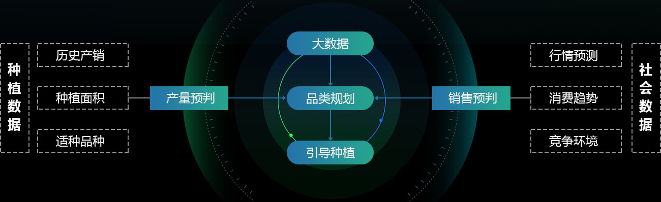 通过在农业生产现场搭建“物联网” 网络,实现对农业生产现场气候环境、土壤状况、作物长势、病虫害情况的实时监测;为农作物品类建立“气候、土壤、农事、病理”四位一体的农业生产管理模型,将农业生产从因人而异的传统模式,变革为标准化管理的现代模式,通过海量数据驱动农业生产标准化的真正落地。
